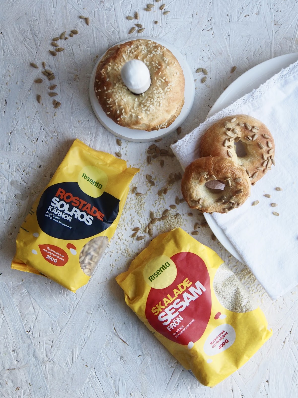 Bagelit ovat mitä mainioin brunssitarjottava, mutta ne maistuu hyvin myös eväänäkin. Pidän erilaisista siemenistä ja niinpä laitoin bageleihin reilusti Risentan Kuorittuja seesaminsiemeniä ja Paahdettuja auringonkukansiemeniä. Siemenet tuo mukavaa makua ja näköä bageliin.