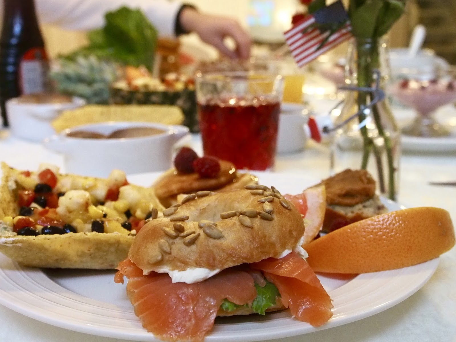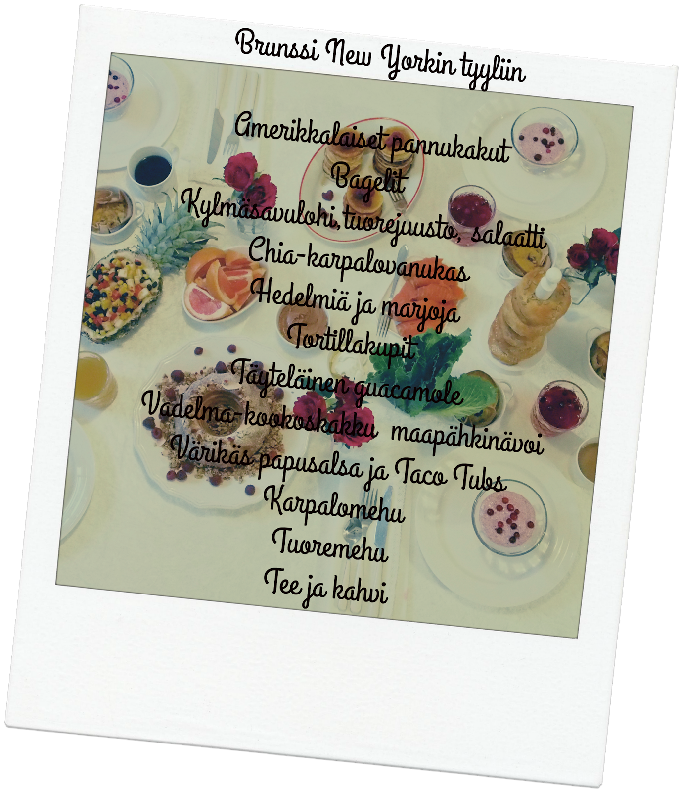 Siskoni lomaruokakuvia katsellessani, maiskuttelin varmasti ääneen. Ruoka näytti niin hyvältä. Lomakuvien inspiroimana päätin olla kätevä emäntä ja loihtia perheelle sellainen brunssin, jota muisteltaisiin lämmöllä pitkään. Halusin tuoda brunssille mukaan myös tunnelmaa, hyvän ruoan lisäksi. Kattaukseen Amerikan lippuja, New Yorkin kukkia eli ruusuja, hauskoja pieniä yksityiskohtia ja taustalle soimaan musiikkia. Eikä mitä tahansa musiikkia, vaan tietenkin ”New York, New York”melodiat! Mikä upea tapa herkutteluun, yhdessäoloon ja nojatuolimatkailuun. Brunssi oli menestys ja tälle matkalle lähdemme taatusti pian uudelleen.