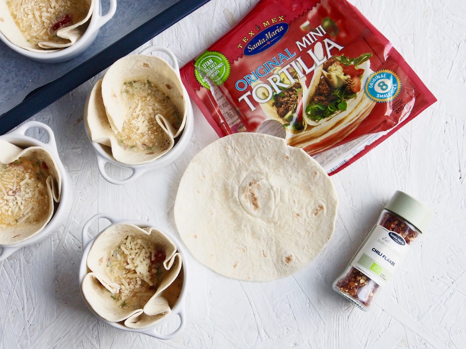 Meidän perheessä tykätään hirmuisesti tortilloista ja niitä tuleekin syötyä usein viikonloppuiltaisin. Santa Maria Tex Mex Mini Tortilla Original lettuset ovat juuri hyvän kokoisia aamiais/brunssitortilloiksi. En kuitenkaan täyttänyt tortilloita perinteisesti vaan tein niistä kepeitä tortillakuppeja. Tortillakupit saivat täytteeksi kananmunaa, juustoa, tomaattia, yrttiä ja ripaus potkua aamupäivään eli chili fleaksia. Tortillakupit ovat hauskaa vaihtelua.