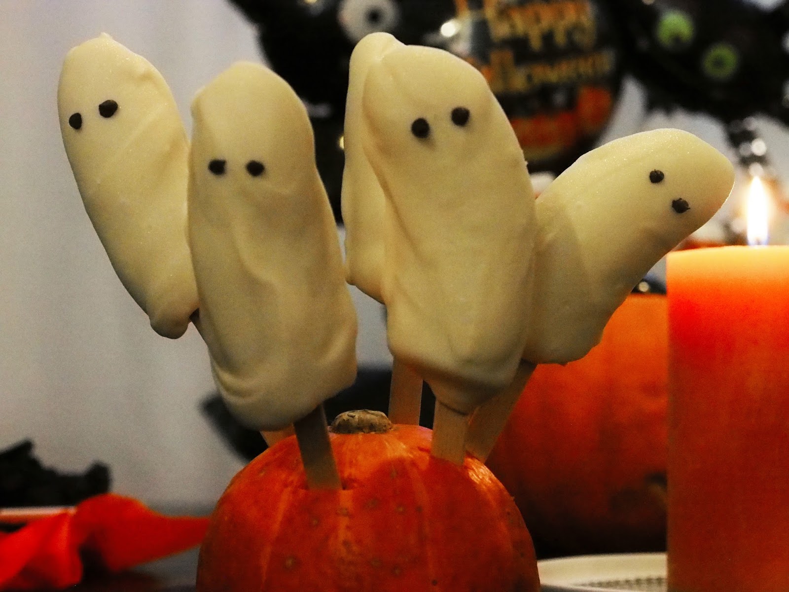 Muumionakit ja Omar-sormet ovat meidän perheen halloweenklassikko, mutta uusin ihastus on K-ruoka-sivuilta bongatut Haamubanaanit. Haamubanaanit on helppo tehdä ja kaiken lisäksi ne ovat niin veikeän näköisiä herkkuja, että eivät ehdi kauan pöydässä vierailla.