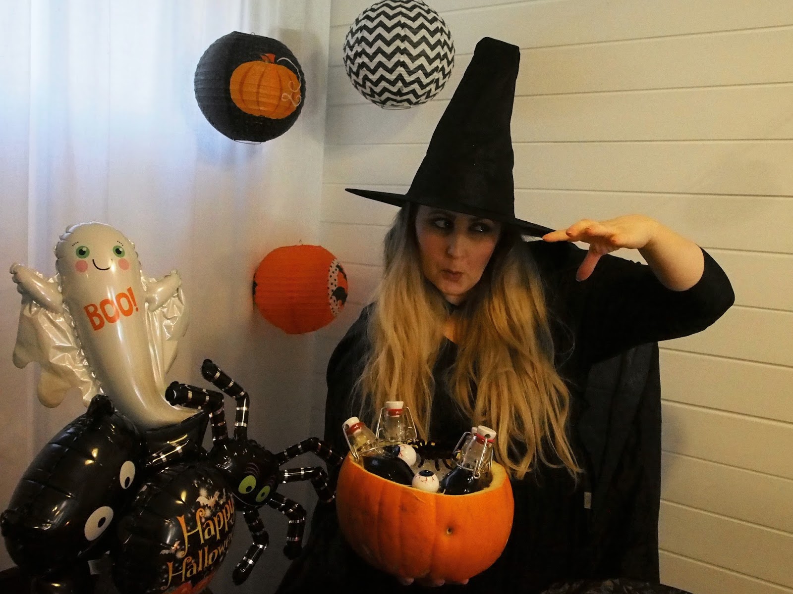 Kaikkea ei tarvitse tietenkään itse väkertää. Citymarketin valikoima oli ainakin niin laaja, että sain kaiken tarvitsemani sieltä samalla kertaa. Löysin lapsille ja meille aikuisille sopivat halloween-puvut, noidan hatut, hämähäkkejä, tekosilmiä, paperisia viirejä sekä lyhtyjä. Hyllyltä löytyi myös luurankoja, ilmapalloja ja kaikkea muuta pelottavaa.