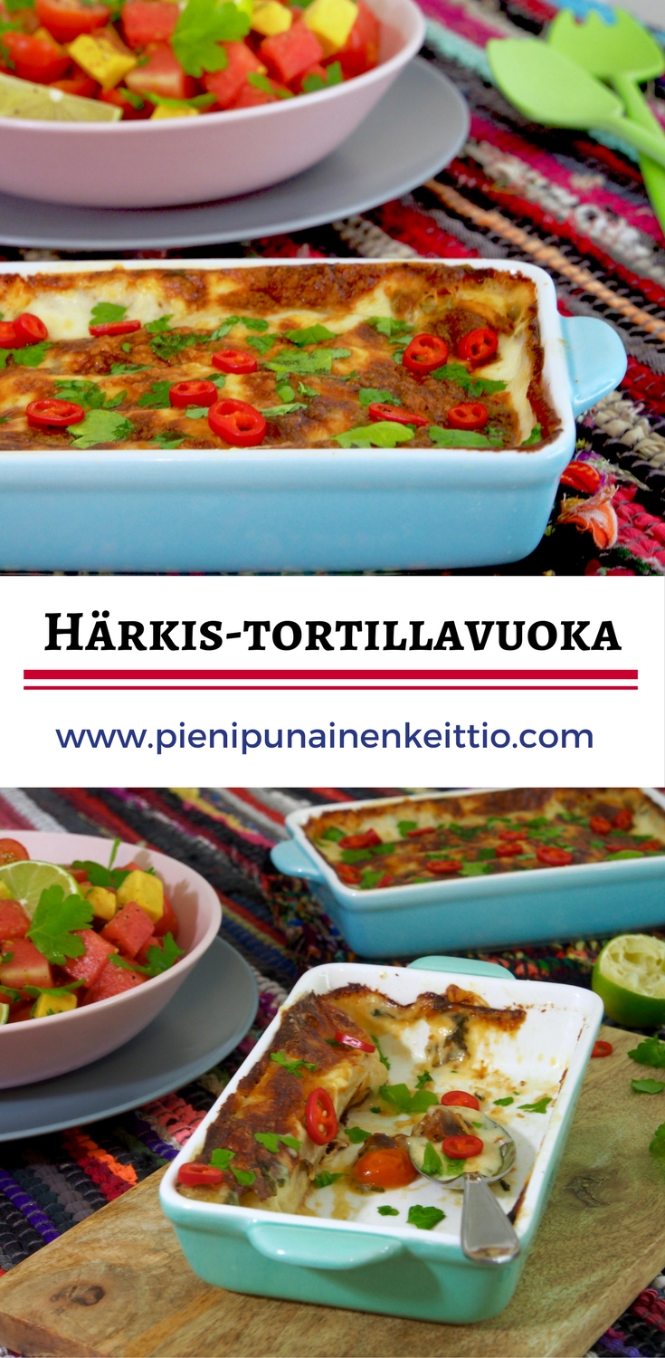 Viikonloppuisin kauppakassiin ilmestyy usein kuin hiipien tortillalättysiä. Tortillat ovatkin meidän perheessä sellaista rentoa ja helppoa nyhjää tyhjästä viikonloppuruokaa. Tortillat täytetään fiiliksen ja jääkaapissa olevien löytöjen mukaan. Tällä kertaa jääkaapissa odotteli purkki kermaa, tomaatteja, juustoa ja Härkistä. Siitä syntyi herkullinen Härkis-tortillavuoka. Härkis-tortillavuoan tekemiseen ei tarvitse keittiövelhon titteliä. Ruoka syntyy kuin itsessään kokemattomaltakin keittiössä häärääjältä. Kaikki raaka-aineet käytetään pikaisesti pannuvierailulla, täyte tortilloihin, vähän rullaati rullaa, juustokastike päälle, uuniin ja eiku syömään.