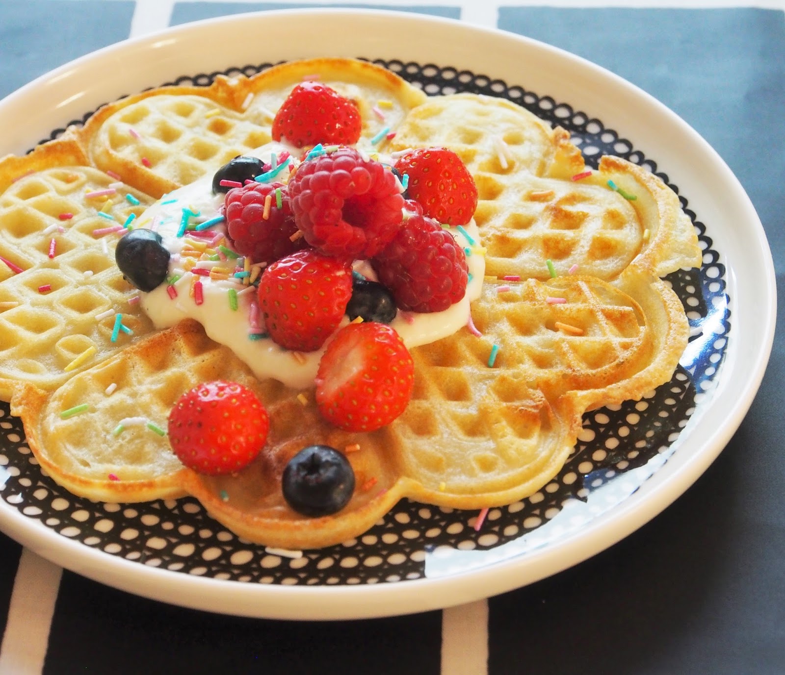 Lapsien eli vohvelimonstereidemme mielestä vohveleiden syöminen on se ihan paras juttu, mutta vohveleiden koristelu tulee hyvänä kakkosena. Miten ihana onkaan katsella, kun lapsien silmät säihkyvät ilosta ja tekemisen riemusta.