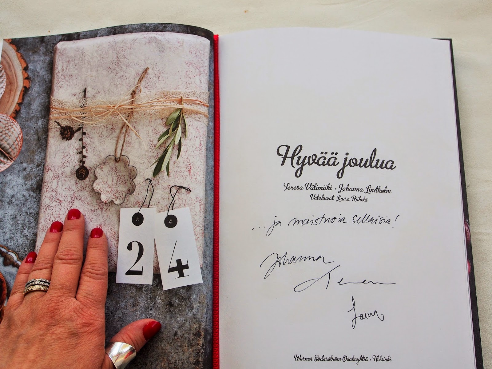 Hyvää joulua on elämyksiä tuova kirja, jonka sivuilta löytyy taianomainen tunnelma. Kauniit kuvat lumoavat ja ne saavat ajatukset liitämään unelmien jouluun. Kirjan monipuoliset reseptit on tehty niin, että ne sopivat ympäri vuoden juhla- ja ruokahetkiin. Reseptit ovat helppoja, jollaisia kaipaakin joulukiireiden keskellä. Kirjassa on myös ihanasti tuotu esille joulun valmistelut; ruokalahjoista, koristeisiin ja miten hyödyntää tähteet herkullisesti joulun jälkeenkin, jos sellaisia jää. Hyvää joulua kirja sopii mielestäni kaikille ruoan ystäville, vuodenajasta riippumatta! Sain mahdollisuuden osallistua kirjan julkaisemistilaisuuteen ja se sai miettimään miksei joulu voi olla aina? Henkilöt kirjan takana: Teresa Välimäki, Johanna Lindholm ja Laura Riihelä ovat löytäneet sen todellisen joulun tunnelman ja ikuistaneet sen kirjan sivuille onnistuneesti. Kiitos heille tästä upeasta joulukirjasta ja oikein hyvää joulua!