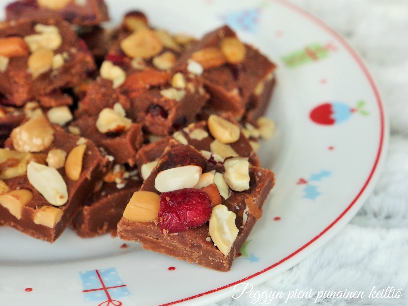 Pehmeä joulufudge pitää sisällään paljon joulun makuja pähkinöistä karpaloihin ja lempeän tuoksuviin mausteisiin. Fudge sopii joulupyhien kahvipöytään ja se on ihastuttava ruokalahja makean ystävälle. Joulufudge on makea ja rikasta, joten muutama pala riittää henkeä kohden kahvipöydän makeistarjoilussa.