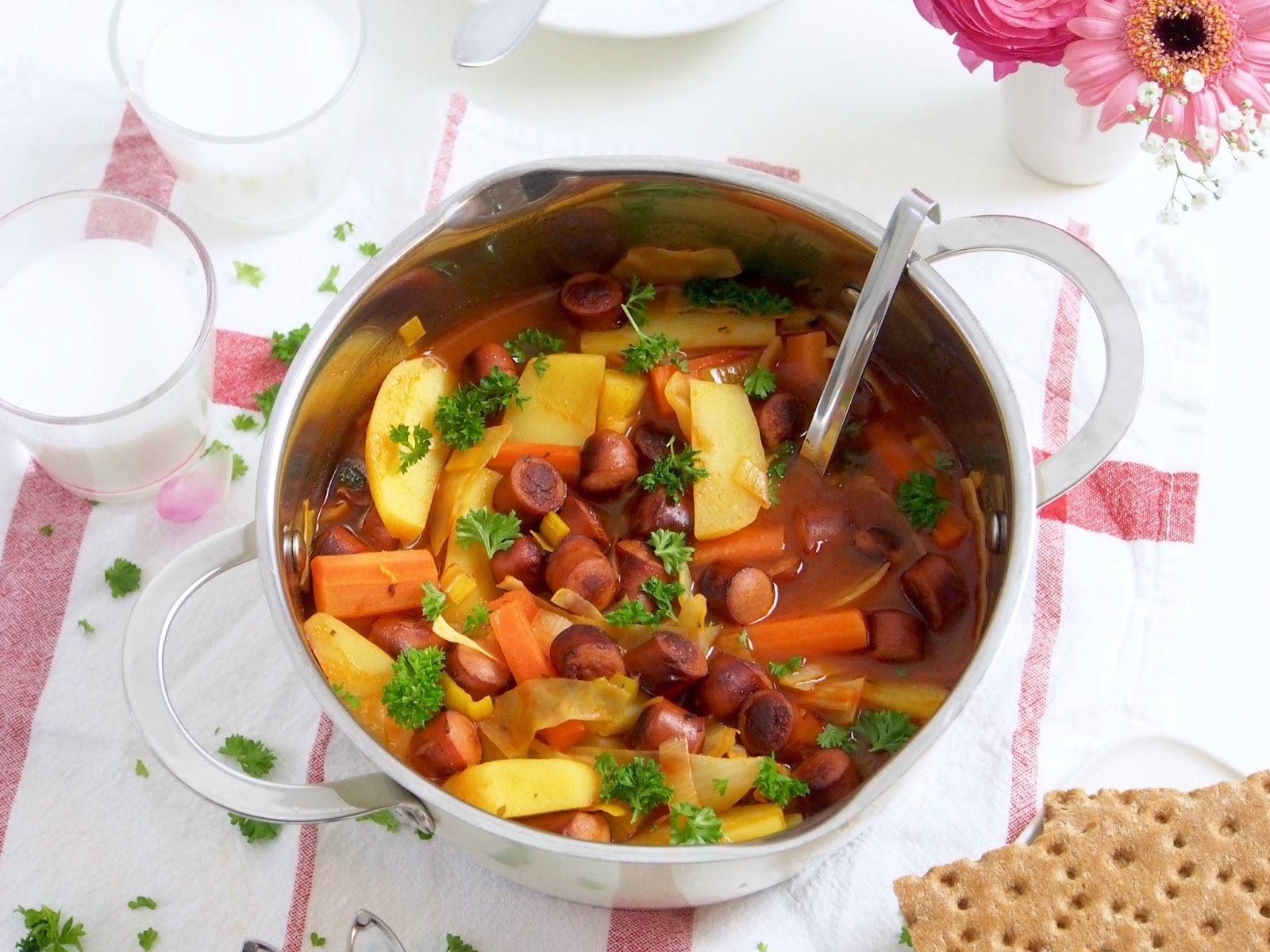 Lapsi tuli koulusta kotiin ja ilmoitti, että hänellä on ihan hirmuinen nakkinälkä. Nakkikeitto oli kuulemma kummitellut mielessä koko päivän. Eihän siinä sitten auttanut muuta kuin laittaa tuumasta toimeen ja nakkikeitto porisemaan. Onnen kantamoinen oli se, että nakkeja löytyi paketillinen jääkaapista. Muutkin raaka-aineet valittiin keittoon sen mukaan mitä kaapeista löytyi. Kauppaan ei ennättänyt lähteä, muuten nakkinälkä olisi voinut kasvaa kiukkunäläksi ja siitä ei olisi iloinnut kukaan. Nakkikeitto onnistu nappiin ja kyllä se kuulkaas maistui niin hyvältä. Sain katettua lautaset kaikille ja pöytään laskeutui hiljaisuus, ainoastaan vieno ryystäminen kuului pöydän toisesta päästä. Kukaan ei ehtinyt puhua, nakkinälkä teki tehtävänsä, meissä kaikissa.