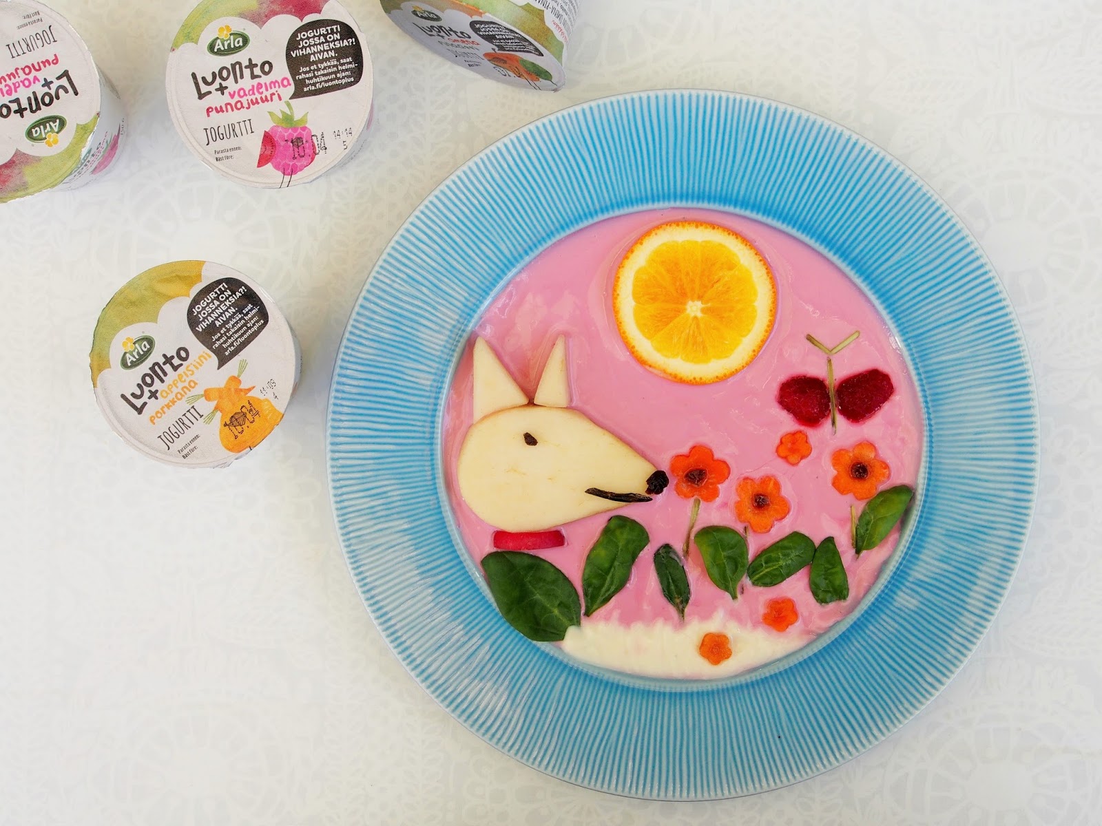 Huikea ruokataiteilija, Norjalainen Ida Frosk ja Arla kutsuivat bloggaajia osallistumaan leikkimieliseen ruokataidekilpailuun. Kilpailun ideana oli tehdä ruokataidetta käyttäen Arlan terveellisiä Luonto+-vihannesjogurtteja sekä mieleisiään raaka-aineita. Jogurttien valikoimissa on pinaatti/omenaa, appelsiini/porkkana ja vadelma/punajuuri maut. Jogurttien värit ovat kauniita ja makukin on kohdillaan, joten otin haasteen vastaan. En tutustunut sen kummemmin ruokataiteeseen, vaan päätin tehdä omaa taidetta. Onni-taidetta, koska Onni on! Onnin kuva varmasti kertoo jo, että kesäpoika nauttii päivän jokaisesta auringin säteestä, lentäen.