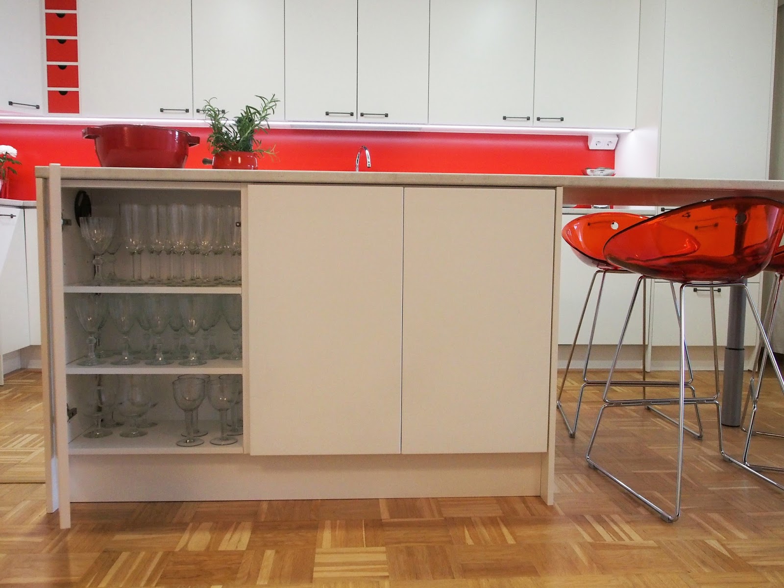 Halusin keittiöön jotain hauskaa yksityiskohtaa. Päädyin valitsemaan Ideal-keittiön valikoimasta pieniä vanerilaatikoita, johon saa nippelinappeli tilpehööriä piilotettua. Maalasin laatikot kolmesti samalla sävyllä kuin välitilan punainen väri on. Laatikoista tuli ihan onnistuneet ja se pieni hauska yksityiskohta, jota kaipasinkin. Lisää spessua keittiöön löysin kuin ihmeen kaupalla nettikirppikseltä. Etsin saarekkeeseen punaisia kestäviä baarituoleja ja siellähän minua odotti Gliss baarijakkarat. Iso kiitos myyjälle, tuolit sai hyvän kodin. Pöytälevyiksi valitsin rouhean valko/harmaan laminaatin, jossa sävy vaihtelee paikottain eläväisesti. Näin keittiön tunnelma ei ole liian valkoinen.