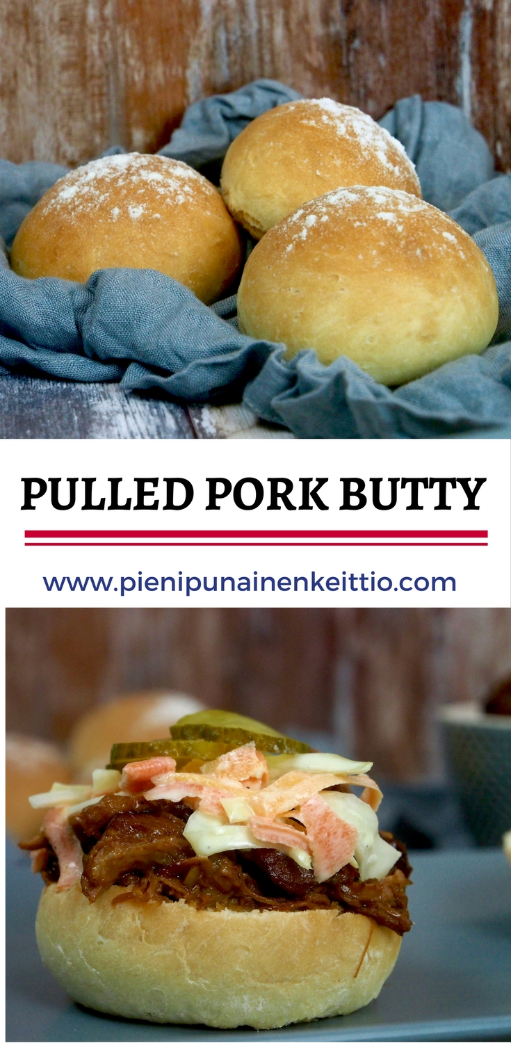 Viikonloppuna on mukava satsata hieman enemmän ruoanlaittoon ja herkutella jotain hyvää arki kiireiden jälkeen. Se ei tosin tarkoita, että keittiössä pitäisi kökkiä koko viikonloppu. Laadukkaat raaka-aineet ja ruoka, joka maistuu koko perheelle on minun satsaukseni weekendiin. Uuniruoat sopii hyvin siihen ajatukseen. Yksinkertaista ja ei tarvi kuin laittaa mausteet lihaan, koko komeus uuniin ja ruoka valmistuu kuin itsestään. Possun lihaa tulee enään harvoin syötyä, mutta silloin tällöin viipale pekonia tai pulled porkia eli nyhtäpossua on tervetullutta ruokapöytään. Mausteita ja lihaa vaihtamalla nyhtöpossuun saa potkua oman fiiliksen mukaan. Tällä kertaa pulled pork sai tumman marinadin ja pääsi brittiklassikko butty-sämpylän väliin. Kyytipojaksi vielä raikasta fenkoli-coleslawia ja suolakurkkua. Aivan huippua viikonloppuruokaa ja keittiössäkään ei tarvi tämän vuoksi nipottaa. Pulled pork sopii hyvin esim. burgereihin, tortilloihin, pizzan täytteeksi, piirakoihin, salaattiin tai vaikkapa lisukkeeksi riisille. Oman mielen mukaan ja nyt syömään…..