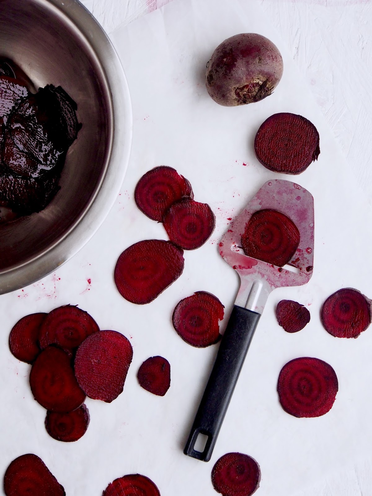 Viipaloi punajuuret juustohöylällä, mandoliinilla tai juuresraastimella, jotta saat niistä ohuita.