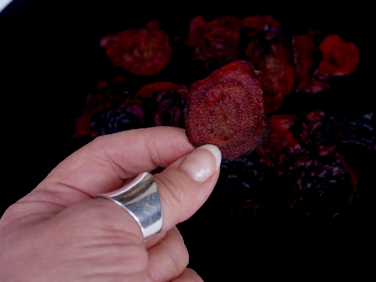 Tarjoilin lapsille ja heidän kavereilleen punajuuri sekä bataattisipsejä. Lapset hieman empivät ensin ja maistoivat varoen. Pian huoneesta kuului”saiskos lisää”? Kaikki menivät ja naapurin poika kävi vielä kehumassa, niiden olevan ihan parhaita ja onhan ne hyviä. Uusi satsi lähtee uuniin illalla!