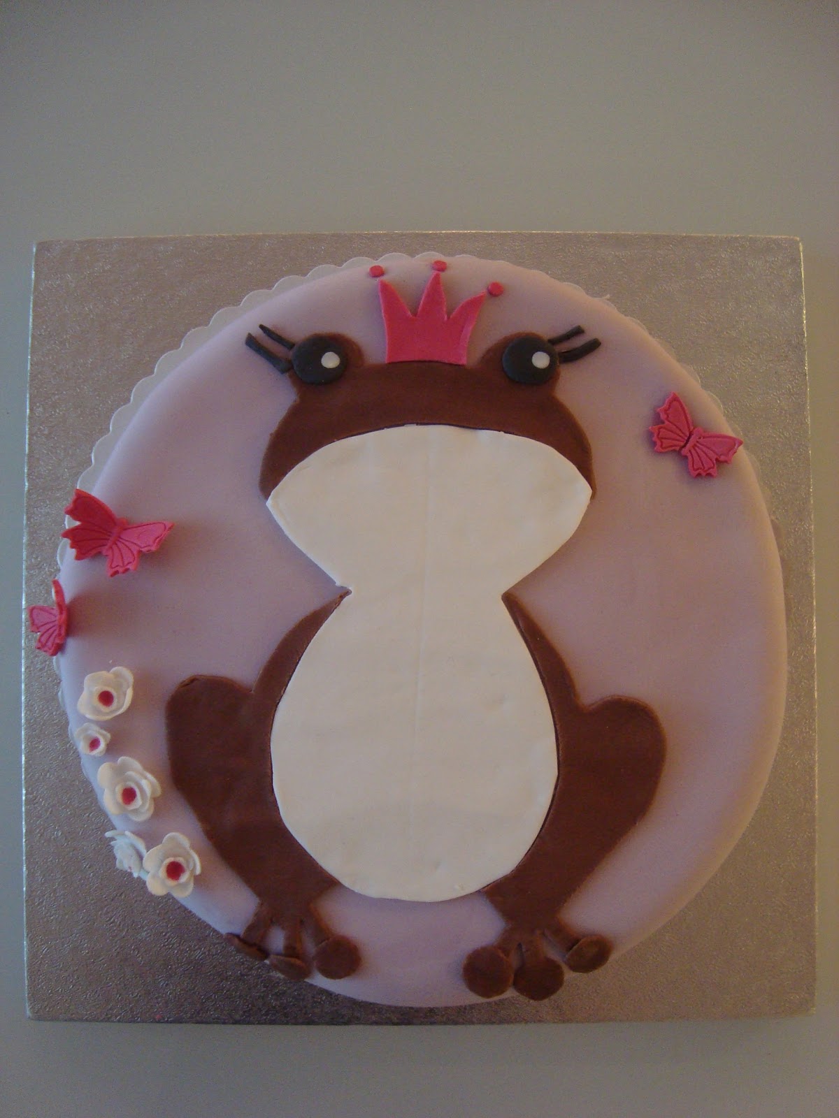 Tein me & i kutsuille täytekakun, jossa kurnuttaa sammakkoprinsessa koristeena. Tämä sammakko on keskeinen hahmo vaatemerkille. Täytekakun päällinen sekä sammakko on tehty sokerimassasta. Täytteenä on vadelmaa sekä vaniljakastiketta.